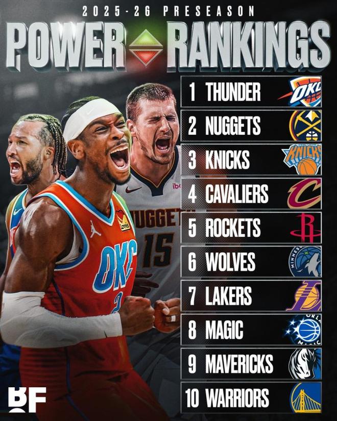 我们可以看到排名情况是这样的,雷霆、掘金、尼克斯排名新赛季实力榜前三位,第四和第五分别是骑士和火箭,第6~10名分别是森林狼、湖人、魔术、独行侠、勇士。那么这份排名到底在哪些方面有很大的争议呢?