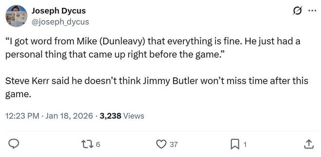 赛后科尔表示自己已经从总经理迈克-邓利维那里知晓了一切,巴特勒只是比赛前遇到了一些私事,不会错过接下来的比赛。