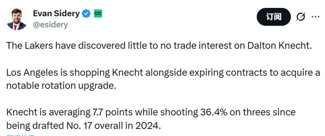 另外,Sidery还报道称,湖人队发现联盟各队对于克内克特的交易意愿几乎为零。湖人方面曾计划将克内克特与到期合同打包交易,以求换来一名能显著提升球队轮换实力的球员。