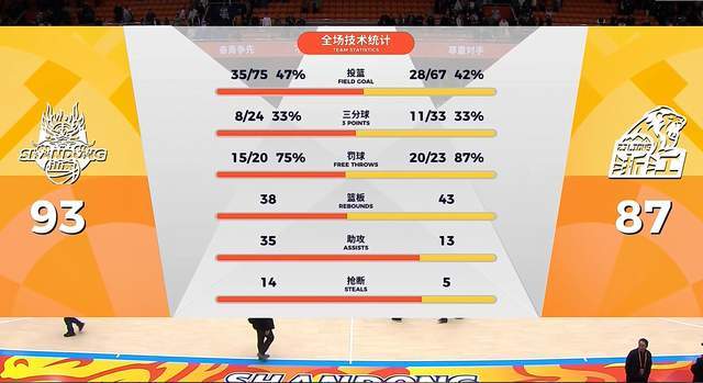 末节决战,广厦队继续保持强势追分,打得山东队有些招架不住。高诗岩一度阻挡孙铭徽吃到违体犯规。布朗连续砍分,帮助广厦队追到只差10分。好在山东男篮没有崩盘,愣是又咬住了比分。珀赛尔犯规,送孙铭徽2罚2中之后,广厦队终究还是追到了个位数。不过,就这场比赛的哨子来说,裁判还是太偏了,山东队频频被吹犯规,现场球迷不该这么温柔,毕竟这是山东队在济南的第一场比赛。最终,山东男篮主场爆冷,以93-87击败了广厦队,终结了对手的7连胜。