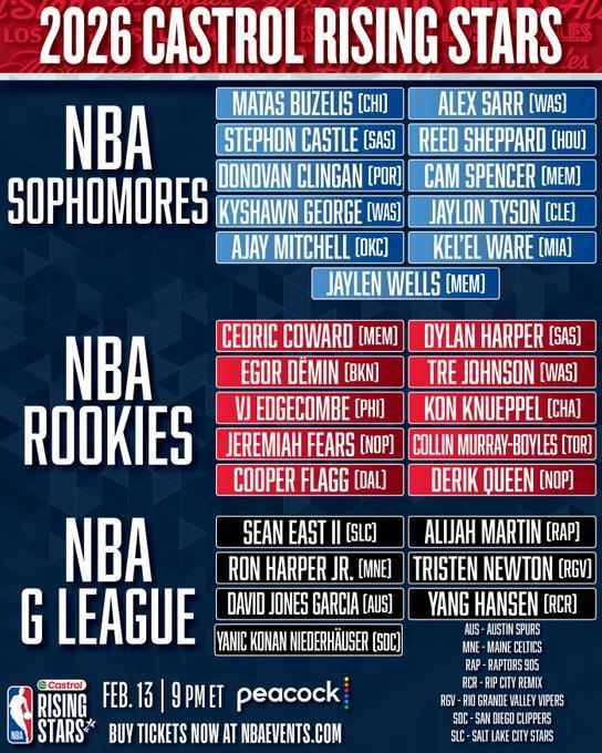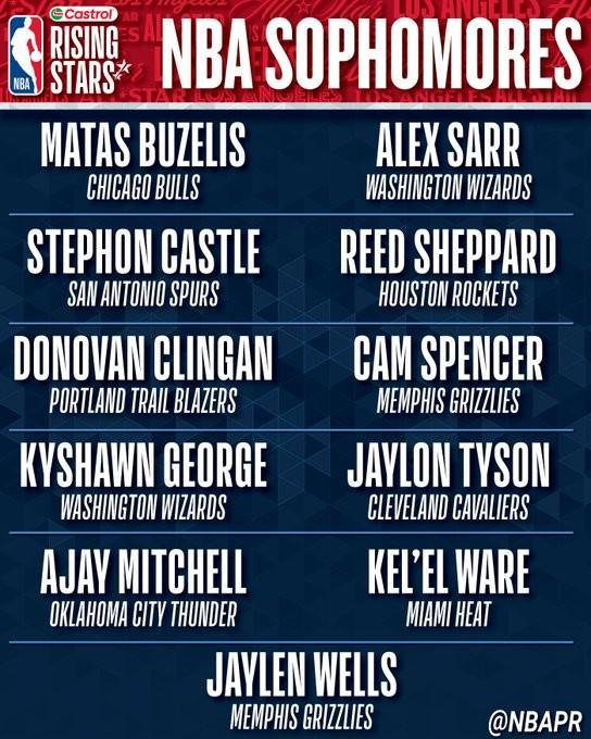 北京时间今日,NBA官方公布了本赛季全明星赛新秀赛名单,中国球员杨瀚森入选G联赛队,今年前四顺位全部入选一年级队,去年的状元秀里萨谢落选二年级队。