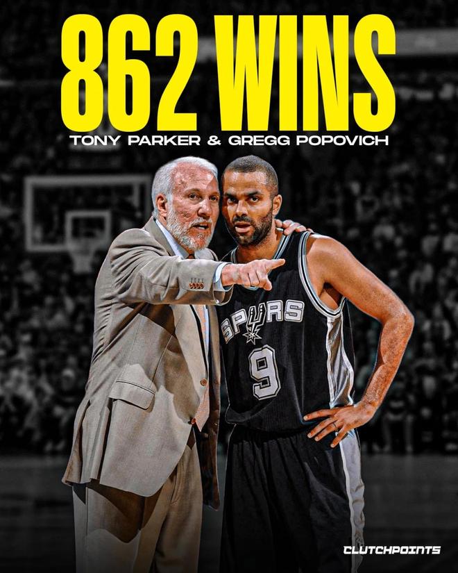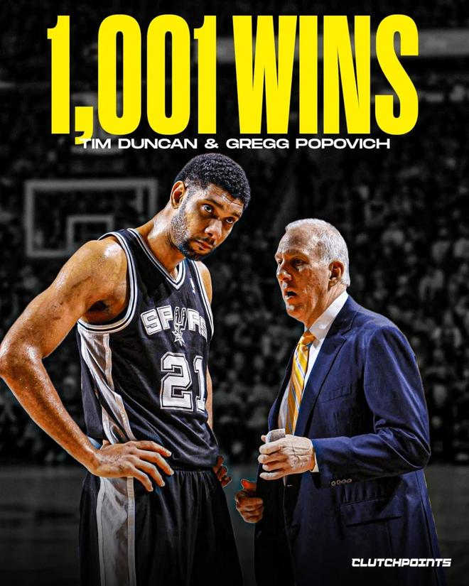 其中,邓肯与波波维奇搭档拿下1001场胜利,排名历史第一,历史前十中仅有两队搭档是现役球员与现役主帅。