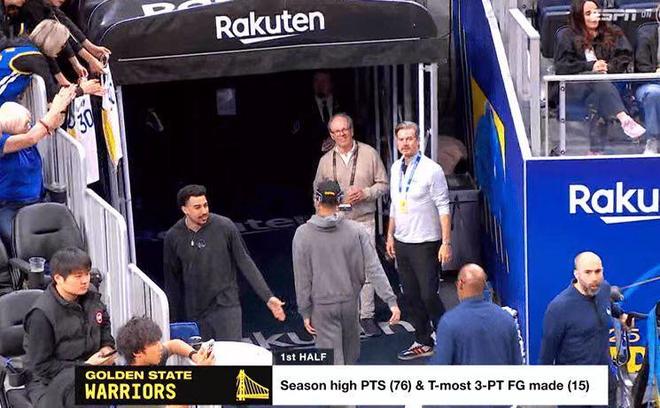 勇士上半场命中15记三分追平本赛季半场最高纪录,上半场轰下76分创球队本赛季新高,此前是72分。