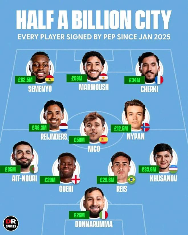 据《转会市场》统计显示,曼城自2025年1月以来在转会市场总投资高达4.8亿欧元,总共引进了14名新援。而这些新援完全能够组成一套英超实力强劲的首发阵容: