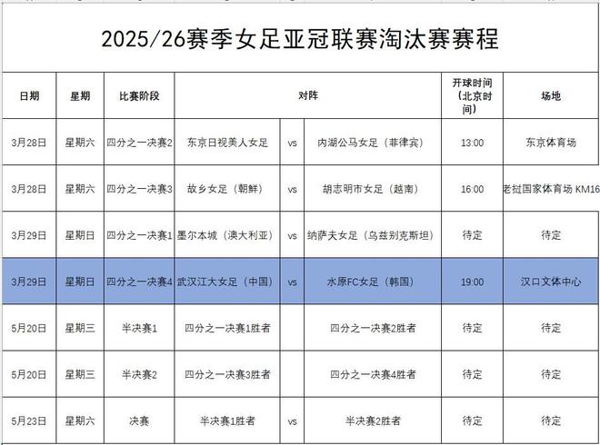 官方:亚冠1/4决赛武汉女足vs水原女足将于3月29日19:00进行