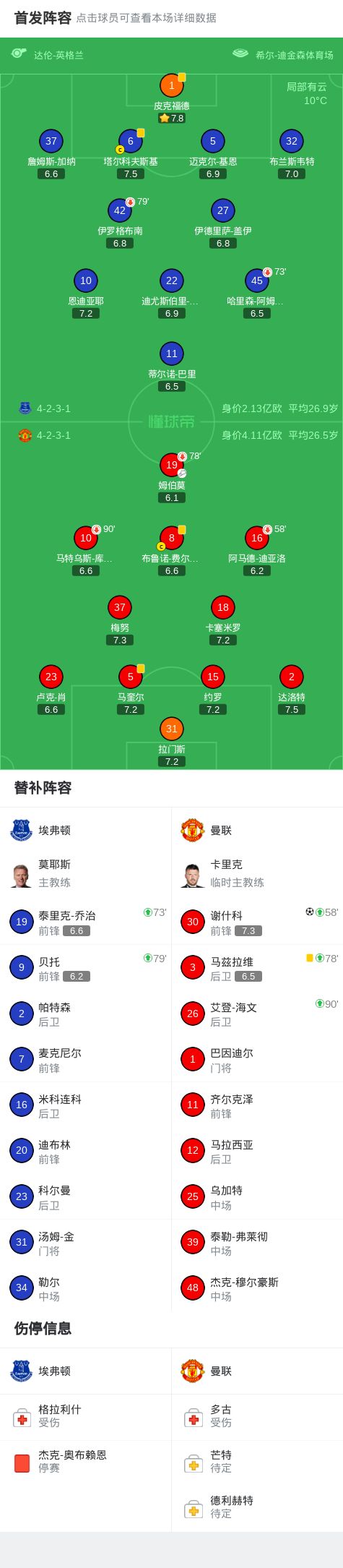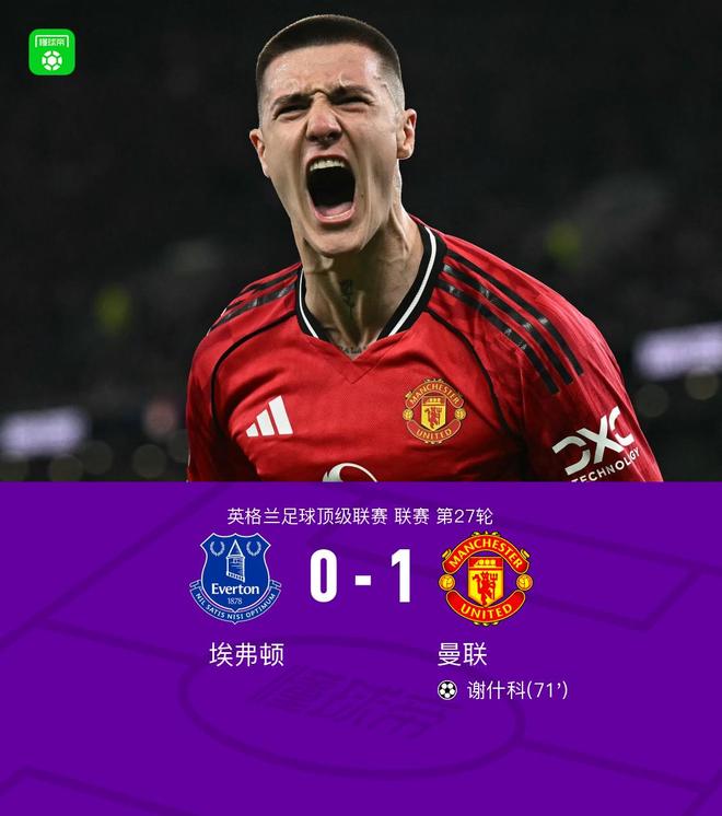 北京时间2月24日英格兰足球顶级联赛 第27轮,埃弗顿主场对阵曼联。上半场,阿马德、达洛特相继造险。下半场,库尼亚长传反击,姆伯莫助攻,谢什科替补登场,推射破门。最终比分埃弗顿 0-1 曼联。